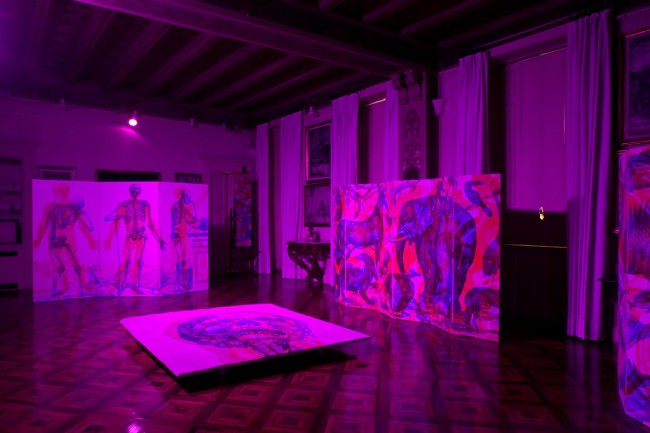A second interior installation includes Carnovsky’s screens in lacquered wood with antique engravings of animals, anatomy, and hand made carpets. These limited edition items were produced by the Italian company Artep Italia.