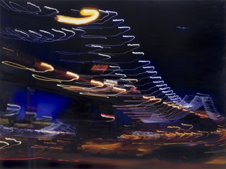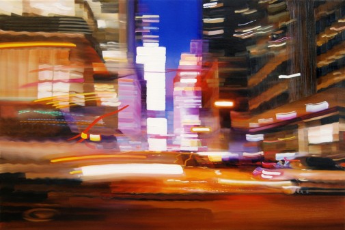 Her work is a blurred realism that seems almost as clear and crisp as if it were focused. She calls these series Visual Intoxication, and as Alex ponits out, the paintings “capture the pace, energy, and movement of the city.” For this show the pieces are views of the Manhattan Bridge. She created them while in residency at a DUMBO studio provided by the New York Foundation for the Arts. She goes big, so the work is easy to get lost in from up close or afar. I’m looking forward to catching the show. See you there, blurred maybe, but I’ll see you.