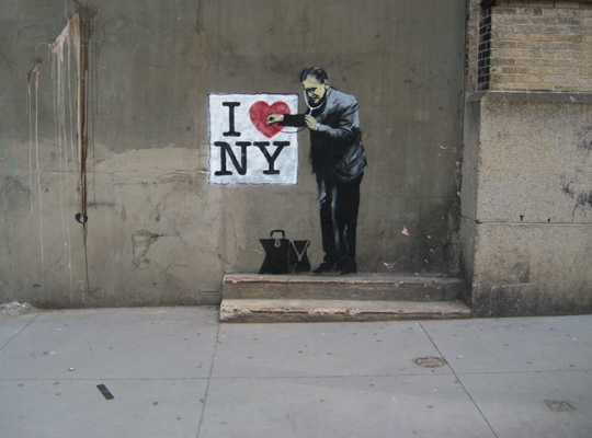 UK street artist Banksy has been on a roll lately, dropping his first feature film, Exit Through The Gift Shop, and going on a non-stop graffiti tour of the US and Canada. He’s already hit San Fran, Chicago, Toronto (most of which were painted over or removed unfortunately) and now New York City, which marked his first (!) time in the city. The art above is downright amazing. Check it.