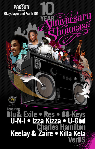 Okayplayer continues to celebrate our 10 Year Anniversary, alongside Frank 151, as we hit South By South West this month, in Austin, TX! Make sure to hit up our afternoon-evening showcase Saturday the 21st at Speakeasy (412 Congress Ave #D), presented by Pacsun and featuring Blu & Exile, Res, 88-Keys, U-N-I, Izza Kizza, U-God, Charles Hamilton, Keelay & Zaire, Killa Kela and Verbs. DJ sets by The RUB, Illo, Platurn, Mike Nice, Excel, JayCeeOh, The Philadelphyanz, Keelay, Nana Chill, and Squincy. The showcase is 12-6pm, and The Rub is 7-10pm. Make sure to RSVP to events@frank151.com. Follow me after the jump for the full flyer (front/back) and more details. See y’all in Teeexas!