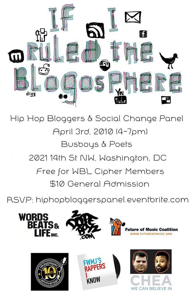 Co-sponsored by Words Beats & Life (WBL) and the Future Music Coalition (FMC) and hosted by Busboys & Poets, this event will feature a national panel of hip-hop bloggers who will give information to those trying to be featured on hip-hop blogs about how to get the attention of these bloggers, optimize web presence, learn what bloggers seek when generating content, and how use technology in acceptable formats. We will also discuss pay-to-purchase sites (Band Camp, Itunes, Amazon, etc.): use ‘em or lose ‘em? Participants will walk away with a comprehensive list of potential hip-hop music blogs where they can find and post music by independent artists. In the second half of this presentation, FMC will educate the bloggers and audience about legislation and policies currently affecting them and we will address the question: How can we leverage the success of these blogs for social change?