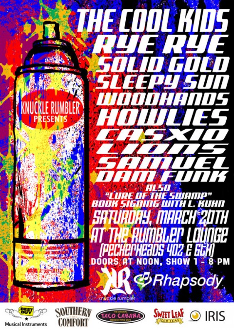 Cool Kids (7:00 pm) / Rye Rye (6:00 pm) / Solid Gold (5:15 pm) / Sleepy Sun (4:35 pm) / Woodhands (3:55 pm) / Howlies (3:15 pm) / Casxio (2:40 pm) / LIONS (2:00 pm) / Samuel (1:30 pm) / Dam-Funk (1:00 pm)