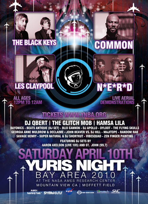 by: StonePosted on: April 5, 2010 Yuri’s Night with Common, The Black Keys, Georgia and Declaime and N.E.R.D, Bay Area BUY TICKETS HERE SPECIAL : FOR THE NEXT 24 HOURS tix will be $40 with the password: YURI