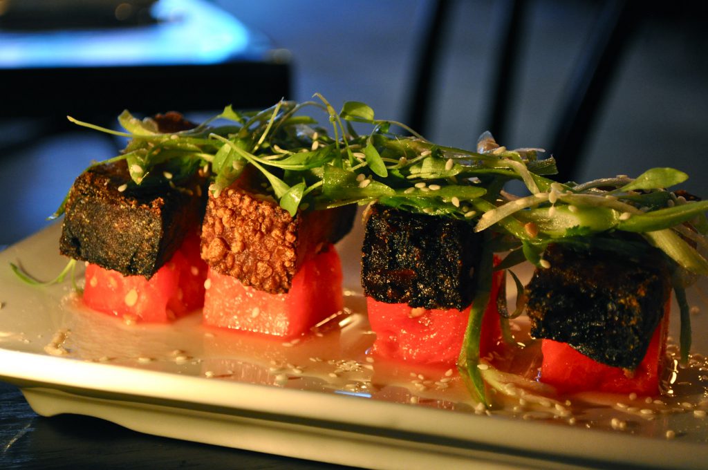 Spring-y, weather appropriate appetizers came next – one, a gorgeous plate of pink cubes of watermelon topped with a satisfyingly crispy and tender pork belly, garnished with greens and sesame seeds. We also enjoyed a creamy, plump burrata sitting pretty over persimmons, all drizzled with a fruity balsamic, and served with a few crispy breads.