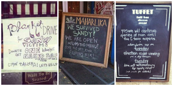 Eater has compiled a great list of eateries that are donating portions of their proceeds to Sandy relief, but you should also explore options not on the list. Don’t forget to hashtag your tweets about your meals and drinks with #DineOutNYC, #EatDownTipUp, or #EatDowntown!