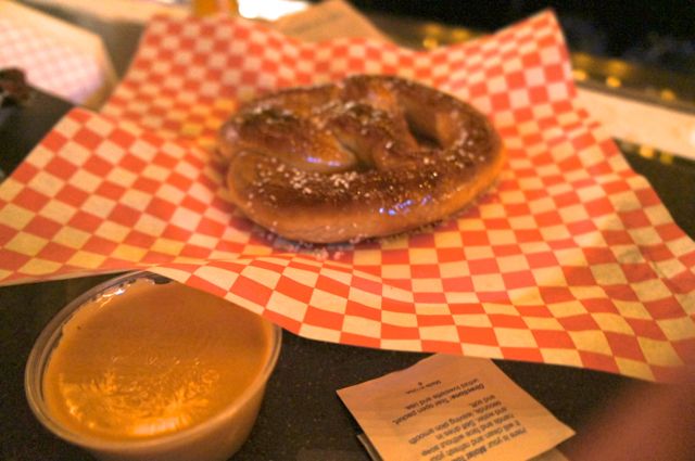 Located just outside of Uptown Charlotte in the Third Ward, VBGB Beer Hall & Garden has over 30 beers on tap.  While they showcase some local breweries like NoDa, Catawba Valley, Birdsong, and Four Friends, they also have many other craft brews, imports, liquor, wine as well as some good eats.  The menu consists of jazzed up bar food like fried pickles and jalapeños, Zweigles brats and hot dogs, beer battered onion rings, vegetarian options, and wings with a variety of Dinosaur sauces. Although those items are decent, the buttery jumbo gourmet pretzel with a side of beer cheese sauce is the star of the show. With a crusty exterior exterior and a soft doughy interior, it is divine.
