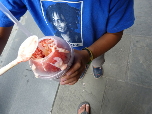 For dessert, immediately following breakfast and brunch, we had a snoball. See Lea’s article about where you can find snoballs in NYC. We asked where we could get the best snoballs in the area, and everyone said Uptown. Unfortunately, we never made it Uptown, so we tried snoballs from Stanley. A snoball is basically like a snow cone but the ice is finer and you can, and should, add sweetened condensed milk to get the delicious creaminess. You can also get your snoball laced with vodka!
