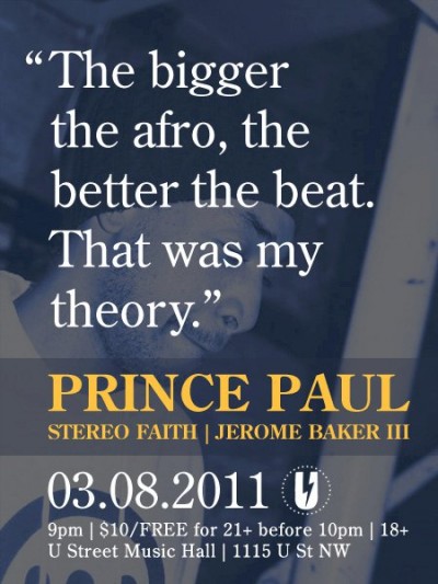And if you’re in the Washington DC area, you gotta come through and check Prince Paul behind the wheels of steel with Stereofaith and Jerome Backer III at the U Street Music Hall, Tuesday March 8 at 9pm. Don’t sleep.