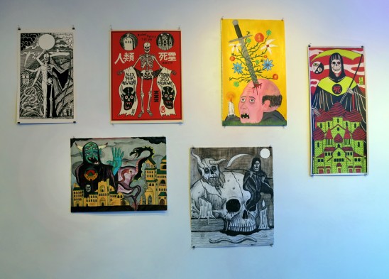 Alexander Heir lives and works in Brooklyn. Among his various ventures, he is the founder of clothing label Death/Traitors, which features graphic tees, varsity jackets, pins and more. The line is decked with imagery inspired by the occult, mysticism, secret society iconography, and other things that would scare some but seduce many more who would appreciate bold graphics, and darkness that does not take itself too seriously. These themes were further explored in the show at the Mishka Store and paired well with the Death/Traitors line sold there since 2011. Alexander Heir also runs the screen printing shop Funbot Press, and he is a partner of Burn Books Records, a publishing and record company, and plays in the band Teardops.