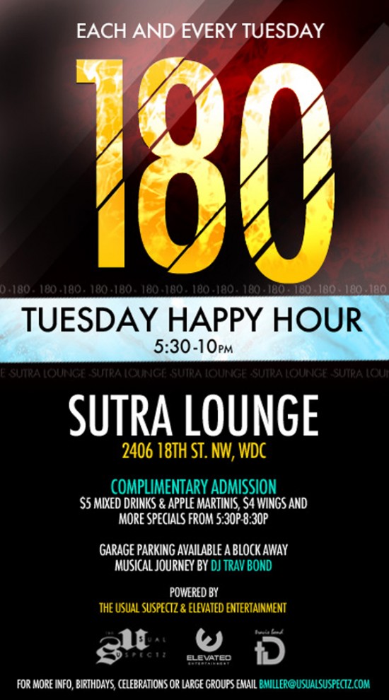 Our Mantra: 180º @ Sutra has been orchestrated by The Usual Suspectz and Elevated Entertainment for the overachievers, trendsetters and tastemakers. It is sure to surpass your greatest expectations and give you an undeniable reason to LOVE 180º at Sutra Lounge.