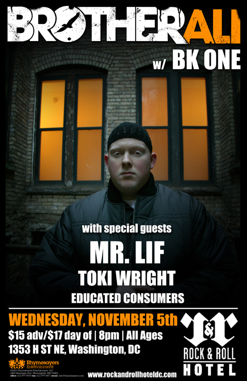 On Wednesday, November 5th, Brother Ali and Mr. Lif take over Rock and Roll Hotel for a post election hip-hop concert. Joining Ali and Lif are Toki Wright and Educated Consumers. Ali is one of the best performers in hip-hop period, and this show is surely gonna be off the chain!