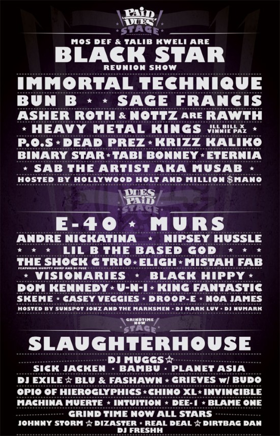 This weekend marks the return of the Paid Dues festival at the NOS Events Center in San Bernardino, California. This year the festival marks the reunion of none other than Black Star (Mos Def + Talib Kweli) as well as Bun B, E-40, Slaughterhouse, and Dead Prez on the bill. Tickets are still available but are going fast. We’re giving away one pair of tickets to the festival right here on The Couch Sessions. All you have to do is fill in the info below!