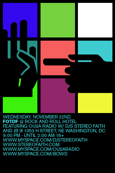 D.C. get here!!! DJ STEREO FAITH & JEROME BAKER + the amazing band OUIJA RADIO (www.myspace.com/ouijaradio) will be giving you the best in Friendster rock, dance rock, electro and more (More = hip hop b*tiches). We have a lot more in store, so dont miss this party and dance with your partner closely…