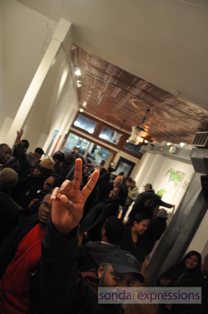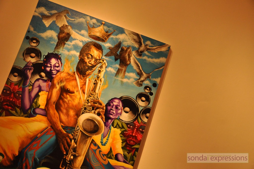 Hardwood floors and white walls. Canvases with images of brown faces inspired by the 70’s. An exhibition of art. A briskly cold Friday night lent itself to an amazing evening of art and social connection. Aniekan Udofia’s “Can You Dig It?” art exhibition was incredible. Aniekan was quite stylish in a blue polyester leisure jacket with white stitching, donning a very sharp fedora and a loud printed shirt, he took us straight to the 70’s equip with the perfect blend of that era’s music spun by DJ Eskimo. “Can You Dig It?” was inspired by the 70’s sitcoms that didn’t stay in the 70’s; instead syndication has generation after generation watching decades later. From Bruce Lee to Marvin Gaye and Fela, this exhibition exploded with color and popped off the canvas right into the room.