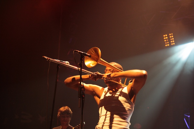 Trombone Shorty started off the night and he’s one of the most entertaining dudes I’ve ever seen live. The 25 year old Shorty (nee Troy Andrews) mans several duties on stage–trumpet and trombone player, crooner, MC, and band leader among others. He does 5 things better than most artist does 1. His theatrics are over the top–as he gives secret hand signals to the band to start and stop songs or flip instrumentals. In addition, he held a single note on his trumpet for over 2 minutes. Dizzy would be proud.