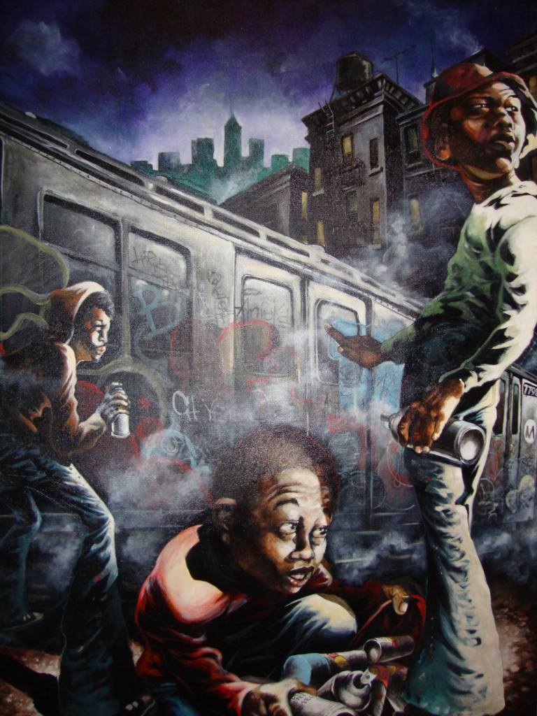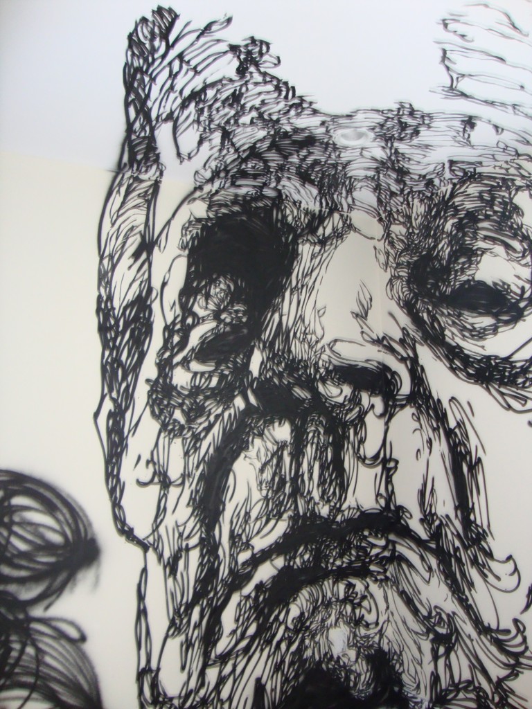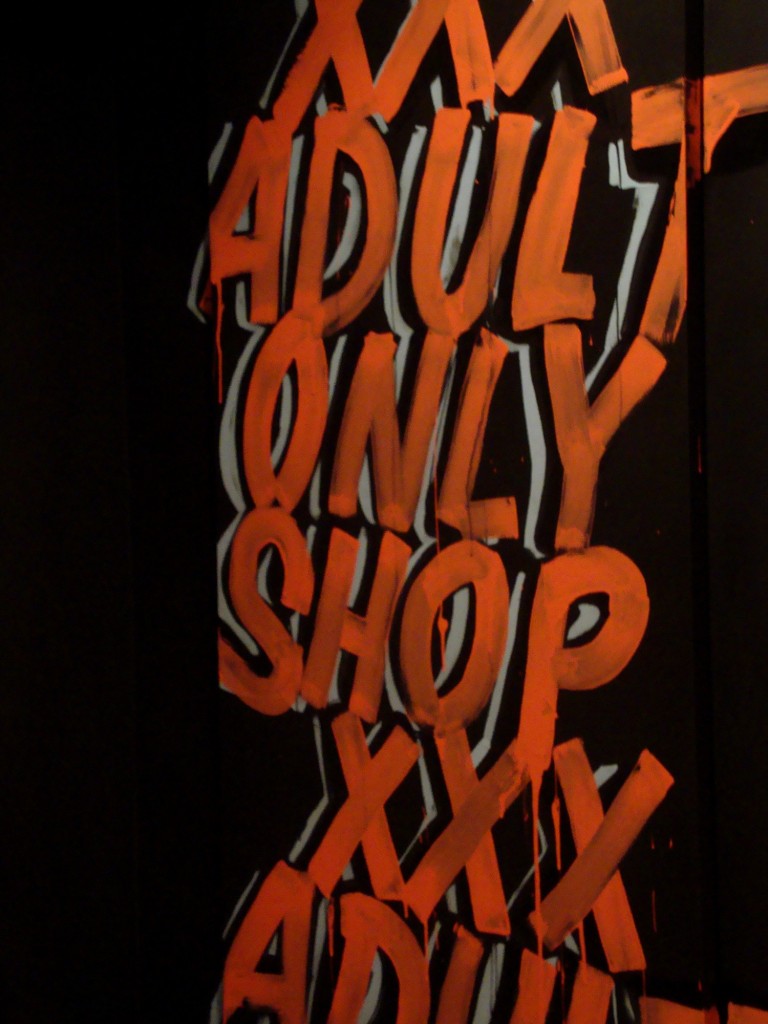 Now the idea of having art galleries and shows pop up in these location is a pretty good idea since it definitely projects and advances the aesthetics many of the works in the show present. It also appeals to the growing number of people who are interested in the mix of modern art and street art. At the same time the setup gave an opportunity for artists to transform and customize their own rooms to fit their artworks. The Kelly Towles room comes to mind, “The Peepshow”, warning us of the nasty XXX nature of her room on the walls, her work incorporates, of course, the peepshow and images, that  otherwise might be considered porn, into cartoon elements using her own style prevalent in her own street art. Creating a unique caricature and commentary with her work, the room with its all black walls and writings/”warnings” on the walls was the best example of Activation 440’s original statement about space, artist and artwork. Get her exact words (and more installation photos) with ReadySetDC here.