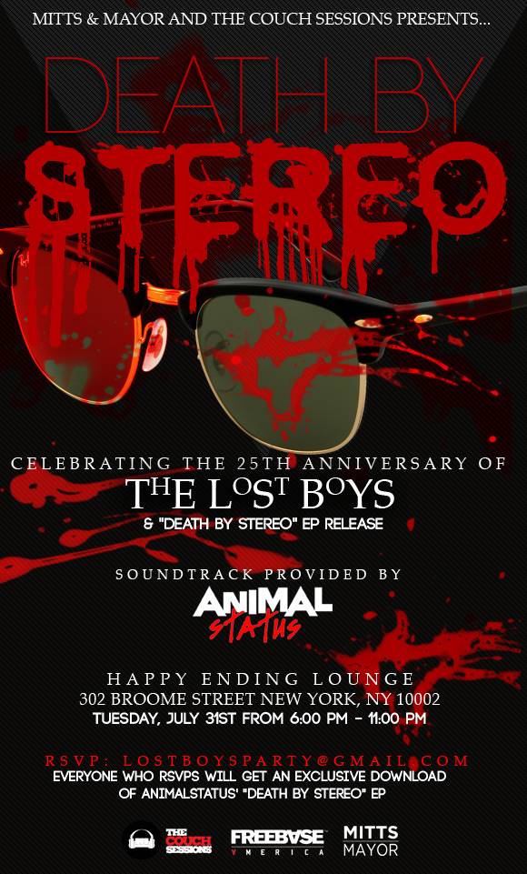 To commemorate the 25th anniversary of their favorite vampire movie “The Lost Boys,” AnimalStatus (DJ Wonder + dB) has put together a 2 track EP called Death By Stereo – with original production from the duo.