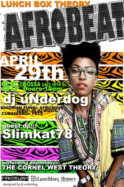 Most of y’all know that we think Lunch Box Theory’s monthly Afrobeat party with DJ Underdog is the hottest party in the city (Washington Post does too), so of course we had to post his latest mix to the world. This one is a bit more ecclectic, starting off with a sweet Sade remix and ending with tracks off of the glorious Madlib in Africa. Of course, Fela and Sunny Ade are included too.