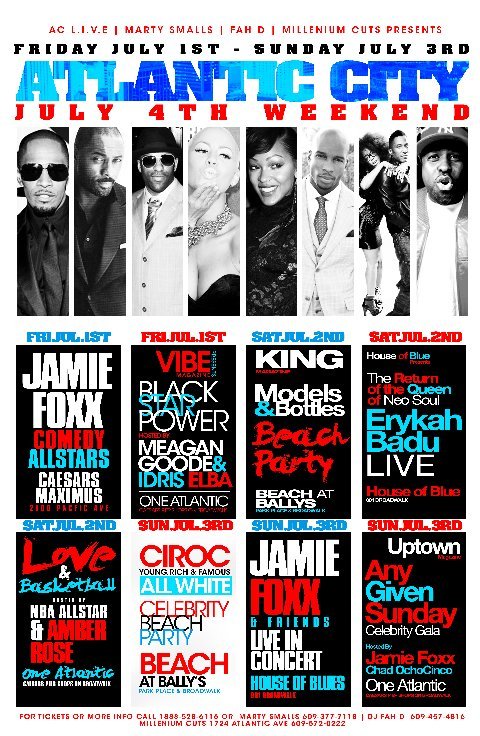 You have the choice of not one, but 6 events that are going down in Atlantic City on July 4th weekend. Choose between Jamie Foxx at the Caesars OR House of Blues, Eyrkah Badu at House of Blues, VIBE Black Star Power gala with Idris Elba and Meghan Goode and MORE and we’ll give you a pair of tickets. All events are listed above. Winner will be chosen Friday, June 24th at noon. Transportation and Accommodations will NOT BE PROVIDED.