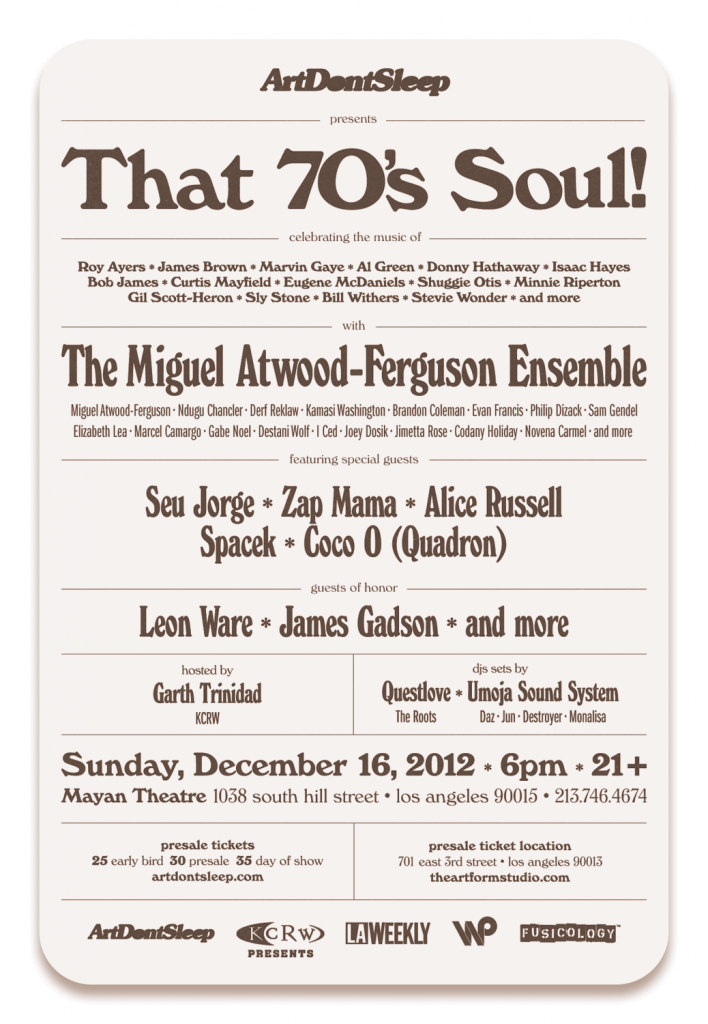 Hey LA Readers, do we have a great giveaway for you. We are giving away a pair of tickets to Art Don’t Sleep’s ‘That 70’s Soul’ show, celebrating sweet soul music featuring, Zap Mama, UK Singer Alice Russell, Coco of Quadron, Brazilian Singer/Actor Seu Jorge, the Legendary Leon Ware, Questlove and more.