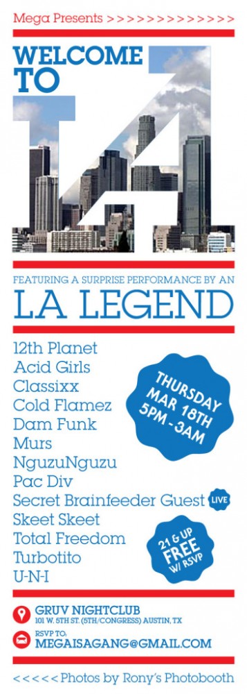 by: StonePosted on: March 8, 2010 Welcome to LA with Classixx, Dam Funk, More SXSW FREE with RSVP at megaisagang@gmail.com